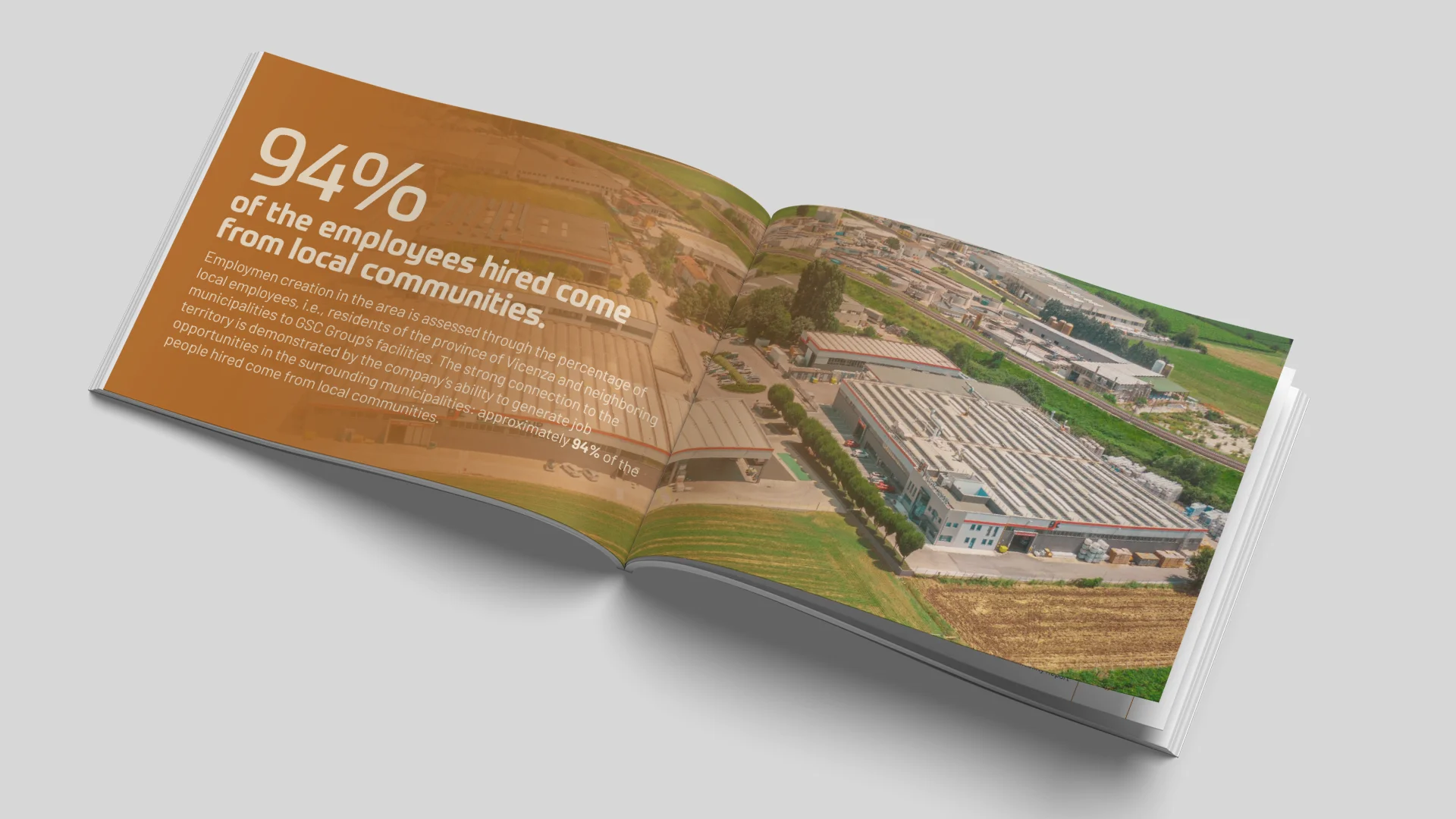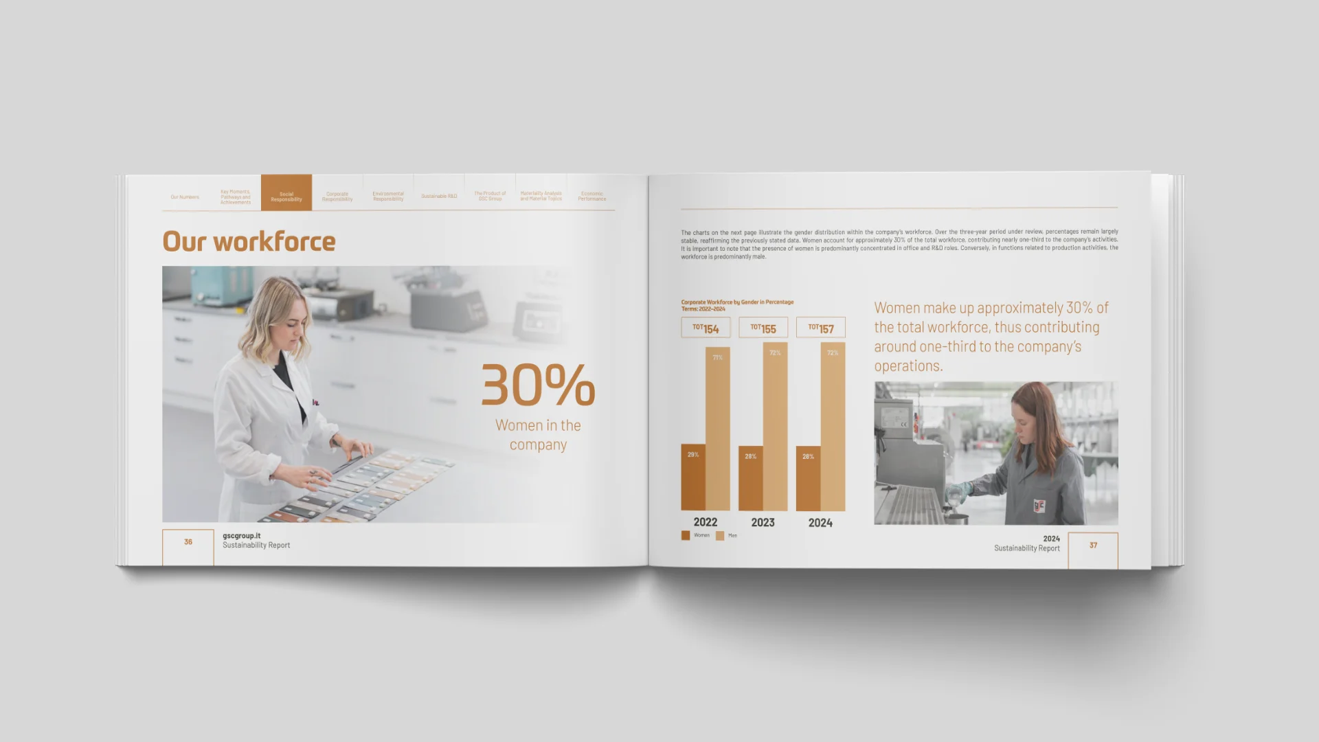 Progettazione grafica e impaginazione del Bilancio di Sostenibilità 2024 per GSC Group, documento chiave per comunicare in modo trasparente l'impegno ambientale, sociale ed economico dell'azienda.