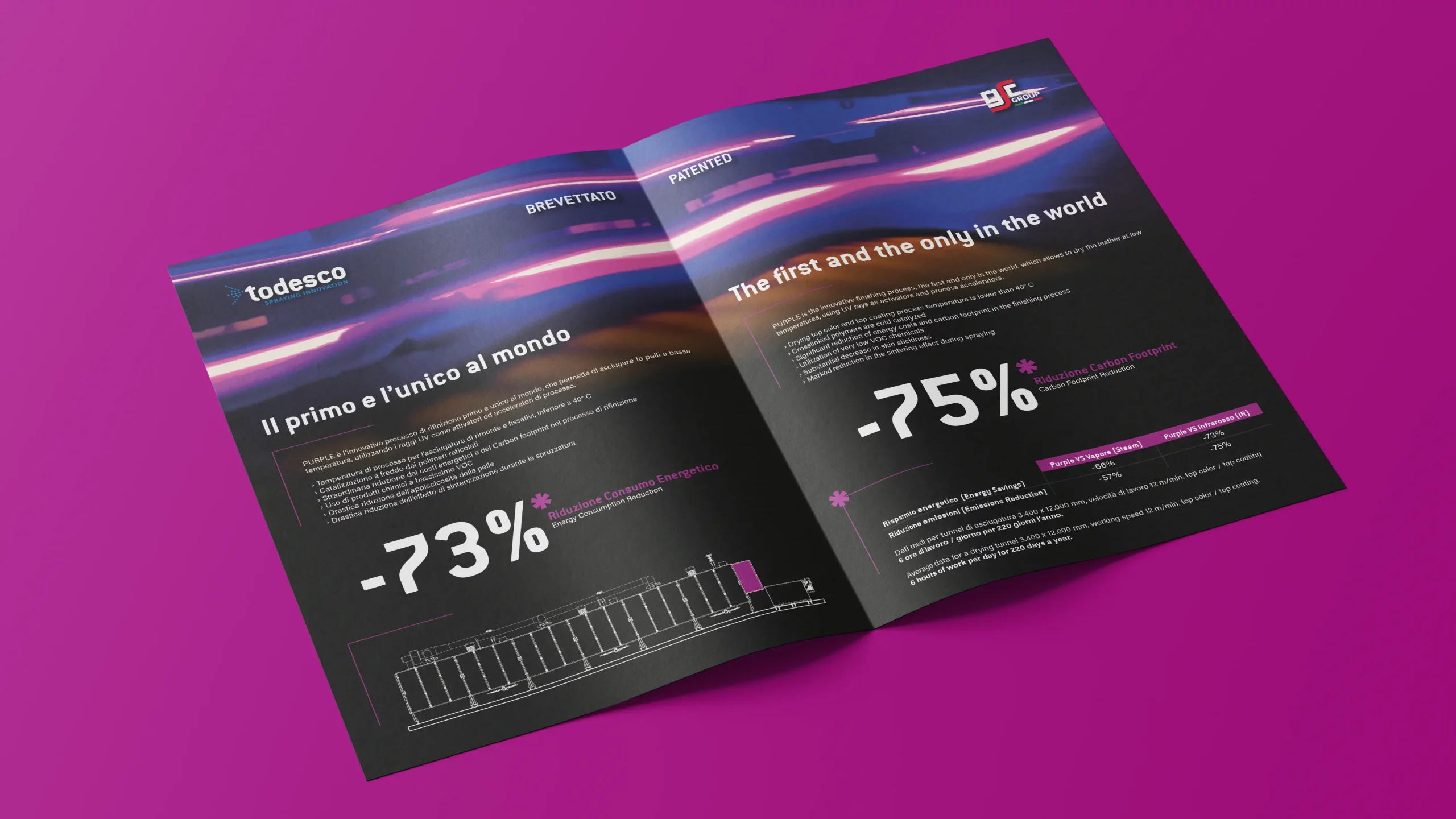 Abbiamo sviluppato un'identità visiva basata sullo spettro della luce ultravioletta. Il gradiente Viola-Ciano su fondo nero "assoluto" non è solo estetico, ma simula l'ambiente di reazione chimica della macchina. Al centro del layout non c'è la macchina, ma il Risultato: abbiamo trasformato i dati tecnici di risparmio (-73% energia, -75% carbon footprint) in elementi grafici monumentali, rendendo immediatamente percepibile il vantaggio competitivo ed ecologico del sistema brevettato.