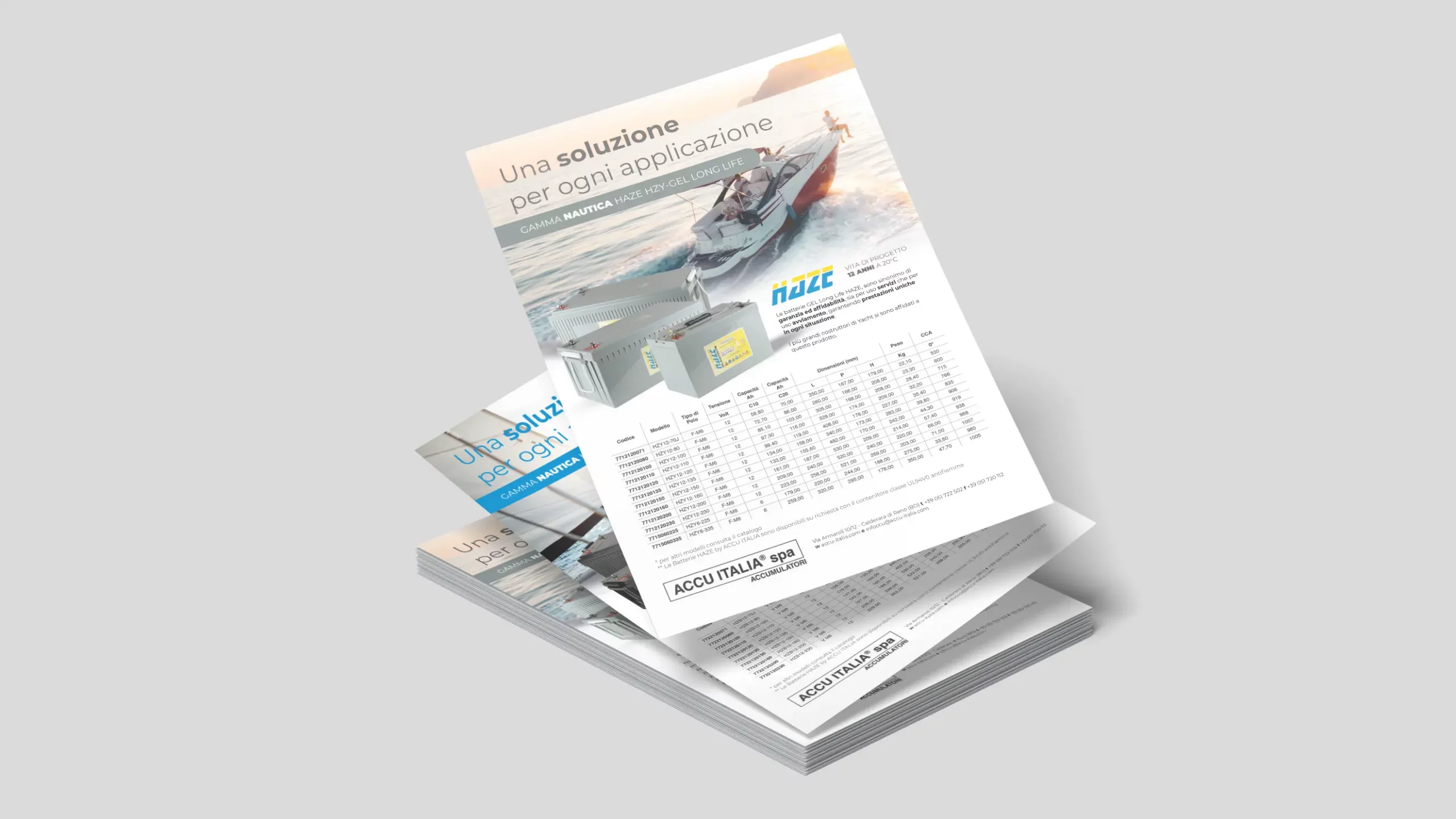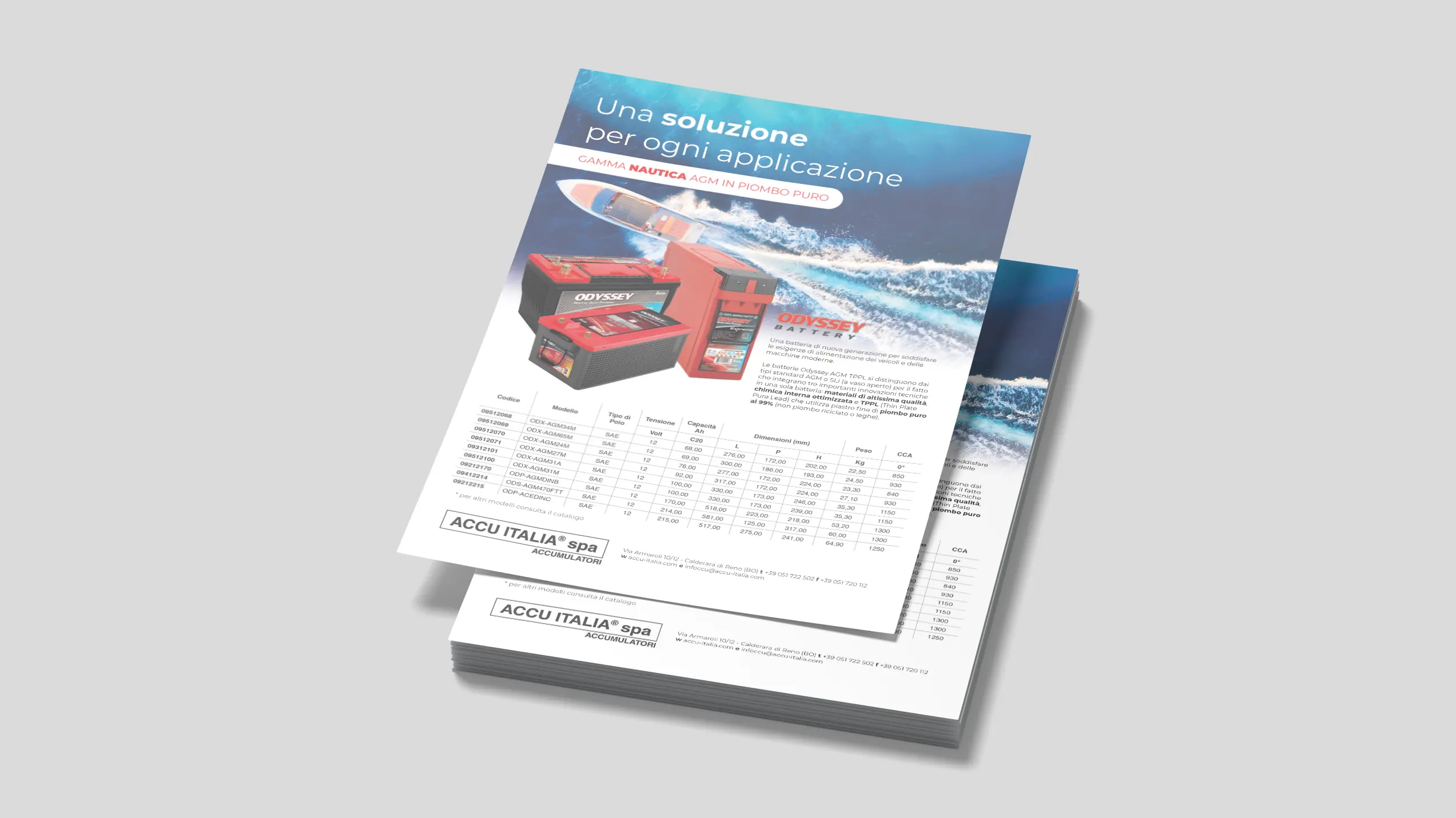 Abbiamo strutturato il layout dividendo nettamente lo spazio: la parte superiore è dedicata all'emozione, con immagini evocative (mare per la "Gamma Nautica", natura per la "Gamma Camper") e il claim "Una soluzione per ogni applicazione". La parte inferiore diventa uno strumento tecnico puro: abbiamo disegnato tabelle ad alta densità con righe alternate per facilitare la lettura dei dati tecnici di batterie specifiche (come le Haze o le Odyssey), trasformando un semplice flyer in una guida all'acquisto tascabile.