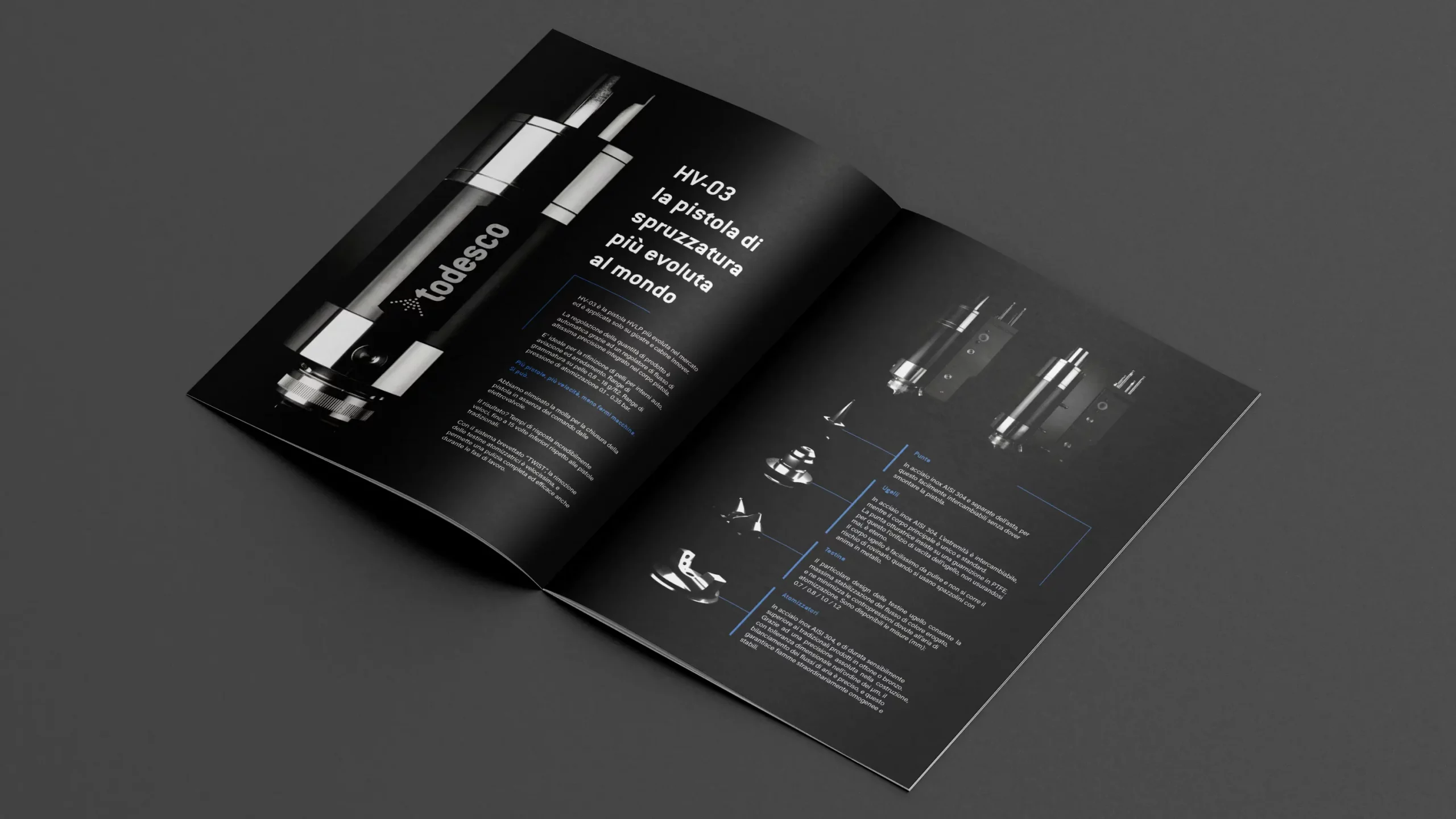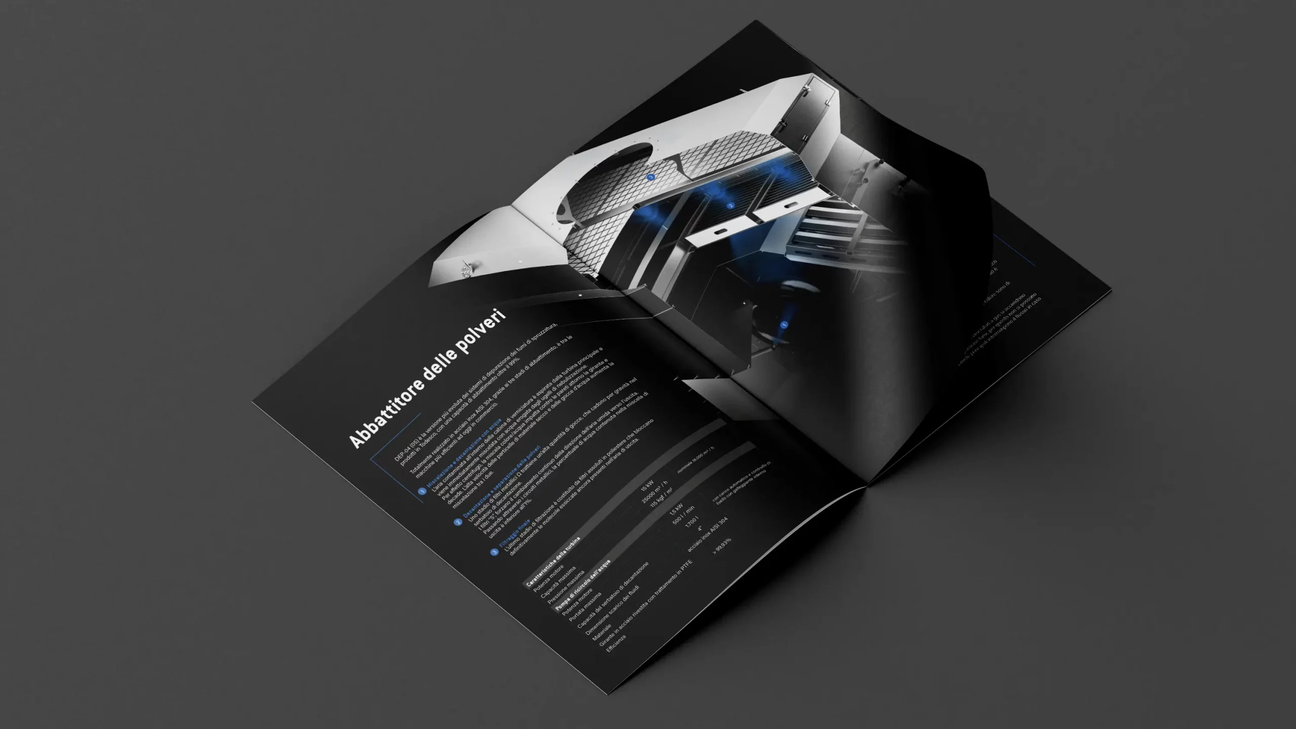 Abbiamo adottato un'estetica "Deep Tech" su fondo nero per esaltare i riflessi dell'acciaio Inox AISI 304. Il layout integra spaccati 3D tecnici (in particolare per l'abbattitore DEP-04 e la pistola HV-03) che svelano il funzionamento interno della macchina. L'uso di infografiche blu elettrico su scuro guida l'utente attraverso i vantaggi ecologici del sistema: risparmio energetico e drastica riduzione delle emissioni.